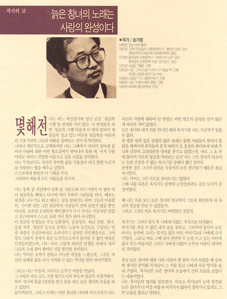 ¿ì¸®³× »ç´Â ÀÏÀÌ ¿¬¼Ó±Øµµ ¾Æ´Ñµ¥ ³¯¸¶´Ù ¹¹ §ÇÑ ÀÏÀÌ ÀÖÀ»¶ó±¸¿ä. ±×Àú ÆøÆøÇÑ Àϸ¸ ¾ø¾îµµ ÁÁÁö¿ä. ¿äÁò ¾î° ÇÏ´Â Àϸ¶´Ù Àß Ç®¸®Áö ¾Ê¾Æ ¸Æµµ ¸ø Ãß½º¸£°í »ç´Â °Í °°½À´Ï±î? ½Ã°£À» ³»¾î ÀϺη¯¶óµµ ÀÏ»óÀ» Åо¼¼¿ä. 1995³â Á¦°¡ ÇÑÂü Á÷Àå¿¡¼ Çб³ÀÏ·Î Çб³Àå°ú ½Î¿ï ¶§¶ó Á÷Àå»ìÀ̵µ ±×·¸°í ÇØ¼ ±âºÐÀ» ¹Ù²Ü °âÇÏ¿© '´ëÇзο¡ ÇÑ ¹ø °¡ÀÚ, °¡ÀÚ' ÇÏ´Ù°¡, °³ÃµÀý °øÈÞ¸¦ ÀÌ¿ëÇÏ¿© ´ëÇзο¡ °¬Áö¿ä. ÀÌ »çÁøÀº ¾çÈñ°æÀÌ ´Ù¸¥ ¿¬±Ø¹«´ë¿¡¼ ÂïÀº °ÍµéÀÌÁö¿ä. '´ÄÀº â³àÀÇ ³ë·¡'´Â 1995³â 9¿ù 30ÀϺÎÅÍ <´ëÇзΠ±ØÀå>¿¡¼ °ø¿¬ÇÏ¿´½À´Ï´Ù. ¿ø·¡´Â ¼Û±â¿øÀÇ ÀÛǰÀ̾úÀ¸³ª, ¾çÈñ°æÀÇ ÀÏÀαØ(¸ð³ë µå¶ó¸¶)À¸·Î ¸¸µé¾úÁö¿ä. ¾î·µç ¿ì¸® ºÎºÎ´Â ¸ðó·³ ºÎºÎ¸¸ÀÇ ½Ã°£À» ³»¾î ´ëÇзο¡ °¡¼ ´«Ç°µµ ÆÈ°í, ÇѲ¯ ¸ÚÀ» ³»¾î °í±Þ À½½ÄÁ¡¿¡¼ À½½ÄÀ» »ç¸Ô±âµµ ÇÏ°í ¿Àº×ÇÑ(?) ½Ã°£À» Áñ°å¾î¿ä. ¹°·Ð °í±ÞÀ½½ÄÁ¡ÀÌ ¸ö¿¡ ¸ÂÁö ¾Ê¾Æ ¾î»öÇßÁö¿ä. ±×¸®°í ½Ã°£ÀÌ µÇ¾î ±ØÀå¿¡ °¡´Ï »ç¶÷µé·Î ²Ë á´õ±º¿ä. ¿ø ÀÛǰÀÌ ²Ï ¾Ë·ÁÁ® Àִµ¥´Ù°¡ ¾çÈñ°æÀÌ ÆîÄ¥ ÁøÁöÇÑ ¿Á¤À» ±â´ëÇÑ Å¿ÀÎÁö ¾ó¸¶ ¾È µÇ´Â °´¼®ÀÌ ½Ã°£µµ µÇ±â Àü¿¡ Âù °ÍÀÌÁö¿ä. Åë·Î¿¡ °£ÀÌ ÀÇÀÚµµ ³õ°í ,±×°Íµµ ¸ðÀÚ¶ó Á¼® ¸Ç ¾Õ ÁÙ¿¡ ³ÎºþÁö¸¦ °ÉÃÄ ÀÚ¸®¸¦ ¸¶·ÃÇÏ¿© ¾É¾Ò½À´Ï´Ù. µÚ¿¡ µè±â·Î´Â 11¿ù 19ÀϱîÁö ¾à 50Àϰ£ °ø¿¬ÇÏ¿´´Âµ¥, °ø¿¬¸¶´Ù Ç¥°¡ ¸ÅÁøµÇ¾ú´Ù°í ÇØ¿ä. ¿ì¸® µÎ »ç¶÷Àº ÇÑ »ç¶÷¿¡ 15,000¿ø¾¿ 3¸¸¿øÀ» ³»°í µé¾î°¬¾î¿ä. ±ô±ôÇÑ ¾îµÒ ¼Ó¿¡¼ Á¶½É½º·¹ '¹æ ¾ÈÀ¸·Î µé¾î°¡µµ ÁÁÀºÁö' ¹¯´Â ¼Ò¸®°¡ µé¸³´Ï´Ù. ¿¹, ±×·¸½À´Ï´Ù. â³à°¡ ¹æ¿¡ ÀÖ´Â ¼Õ´ÔÀ» ºÎ¸£¸é¼ ¿¬±ØÀÌ ½ÃÀ۵˴ϴÙ. ±×¸®°í ¼¼È÷ ¹«´ë À§ ¾îµÒÀÌ °ÈÈ÷¸é ¼Õ¹Ù´Ú¸¸ÇÑ ¹æÀÌ µå·¯³³´Ï´Ù. ±× ¹æ¿¡¼ 90ºÐ µ¿¾È ¾çÈñ°æ È¥ÀÚ¼ ÁÖ°Å´Ï¹Þ°Å´Ï ¸»À» ½ñ¾Æ³À´Ï´Ù. (ÁٰŸ®) ¿ì¸®³× »îÀÌ Áö±Ýó·³ dzÁ·ÇÏÁö ¾Ê´ø ½ÃÀý¿¡ ÇÑ Ã³³à°¡ °¡ÃâÇÕ´Ï´Ù. ¼¿ï¿¡ °¡Áöµµ ¸øÇÏ°í ¼ÛÁ¤¸® ¿ª¿¡¼ ¿©ÀÚ¸¦ ²Ò¾î ÆÈ¾Æ¸Ô´Â ³²ÀÚ¿¡°Ô ¼Ó¾Æ ¸ñÆ÷·Î °©´Ï´Ù. ±×¸®°í °Å±â¼ â³à·Î 20¿© ³âÀ» º¸³À´Ï´Ù. ¾î´À ³¯ ¾î´À ³¸¼± »ç³»°¡ ´ÄÀº â³à¸¦ ã½À´Ï´Ù. ±×·¡¼ ÀÌ ¿¬±Ø óÀ½¿¡ ´ÄÀº â³à°¡ ¼Õ´Ô ¹æÀ» µé¾î°¡´Â °ÍÀ¸·Î ½ÃÀÛÇÑ °ÍÀÌÁö¿ä. ¼Õ´Ô°ú ¼ÒÁÖ¸¦ ¸¶½Ã¸ç ÀÌ·±Àú·± À̾߱⸦ ÇÏ´Ù°¡ â³à´Â óÀ½À¸·Î Áö³ ³¯À» Åоî³õ½À´Ï´Ù. â³à°¡ ¹ñ´Â ¸»¿¡ °ü°´µéÀÌ ´«¹°À» È긳´Ï´Ù. Àúµµ ¿©±âÀú±â ¿©·¯ ´ë¸ñ¿¡¼ ¹Ùº¸Ã³·³ ¸¹ÀÌ ¿ï¾ú½À´Ï´Ù. ¿ì¸® °¡¶ô¿¡ ¸ÂÃß¾î Áß°£ Áß°£¿¡ ¾çÈñ°æÀÌ ³ë·¡Çϱ⵵ ÇÕ´Ï´Ù. ¾çÈñ°æÀº ¾ð´Ï ¾çÈñÀº ¸øÁö ¾Ê°Ô ³ë·¡¸¦ Àß ÇÕ´Ï´Ù. ¼Û±â¿ø ½Ã¿¡ ºÙ¿© ±è»óöÀÌ ÀÛ°îÇÑ °¡¶ôµéÀÔ´Ï´Ù. ±× °îµéµµ °¡½¿À» Àú¹Ì°Ô ÇÕ´Ï´Ù. Çϳª¸¸ ¼Ò°³ÇÒ°Ô¿ä. -»ì ºÙ ÀÌ- ³ªÀ̰¡ ¸¶ÈçÀÌ ³ÑÀÀ²² ÀÌ·± ¡Çå µðµµ Á¤ÀÌ µé¾î¶ó¿ì ¿¿©´ü »ìÂ¥¸® ó³à°¡ ³²ÀÚ°¡ ¹ºÁöµµ ¸ð¸£°í µé¾î¿Í ¿À¸Å, ÀÌ½Ê ³âÀÌ ³Ñ¾ú±¸¸¸À̶ó¿ì ²À µ· ¶«½Ã ±×¶õ´Þ °Íµµ ¾øÀÌ ¼Õ´ÔµéÀÌ ¸ð´Ù ³²°°Áö ¾Ê¾î¼ ¾ÈÁï±îÀå ¿©±×¸¦ ¸ø ¶°³ª¶ó¿ì ½âÀº ¸öµÕ¾î¸®µµ ÁÁ´Ù°í ŽÇã´Â ¼Õ´ÔµéÀÌ ÀÎÀÚ´Â Âü¸»·Î »ìºÙÀÌ °°¾î¶ó¿ì ´ÄÀº â³à´Â Àڱ⠽âÀº ¸öµÕ¾î¸®¸¶Àú ¾øÀ¸¸é ±×³ª¸¶ ¿Ü·Î¿ö ÇÒ ³²ÀÚµéÀÌ ÀÌÁ¦´Â ³²°°Áö ¾Ê´Ù°í ÇÕ´Ï´Ù. ¹®ÀÍȯ ¸ñ»ç´ÔÀÌ ÀÌ À̾߱⸦ µè°í, ¶Ç ÀÌ ½ÃµéÀ» Àаí '´ÄÀº â³àÇÑÅ×¼ ½ÅÀÇ ¸ð½ÀÀ» º¸¾Ò´Ù.'°í Çϼ̴ä´Ï´Ù. ´Ù¸¥ »ç¶÷µéµµ ¾î´À Á÷¾÷¿¡ ¸ôµÎÇÏ¿© 20³âÀÌ ³ÑÀ¸¸é ±×·± °æÁö¿¡ µµ´ÞÇÒ ¼ö ÀÖÀ»±î¿ä? ¿¹¸¦ µé¾î ±³»ç°¡ 20³âÀ» ³Ñ±â¸é Àڱ⿡°Ô ¹è¿ì°Ú´Ù°í ã¾Æ¿À´Â Çлýµé¿¡°Ô °¡½¿¿¡¼ ¿ì·¯³ª¿À´Â Á¤À» ÁÙ ¼ö ÀÖÀ»±î¿ä? ¾ðÁ¦±îÁö³ª ±× Çлýµé¿¡°Ô ³²°°Áö ¾ÊÀº Á¤À» ´À³¥ ¼ö ÀÖÀ»±î¿ä? Àå´ãÇÒ ¼ö ¾øÀ» °Í °°¾Æ¿ä. ¾Æ´Ï, Áö°Ü¿öÇÏÁö ¾ÊÀ¸¸é ´ÙÇàÀÌÁö¿ä. '´ÄÀº â³àÀÇ ³ë·¡´Â »ç¶ûÀÇ ¿Ï¼ºÀÌ´Ù'¶ó°í ÁÖÀåÇÏ´Â ÀÛ°¡ÀÇ ±ÛÀ» ÀÐ¾î º¸¼¼¿ä.  |